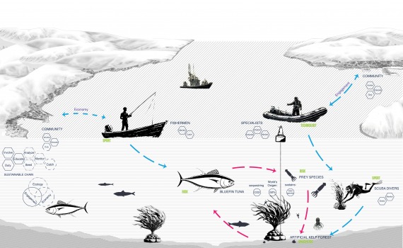 Il progetto propone una strategia rigenerativa per proteggere il tonno rosso, specie in via di estinzione, tramite il ripristino degli habitat delle foreste di alghe. Attraverso ricerche condotte sul Mediterraneo ed a livello globale, il progetto denuncia le pratiche industriali insostenibili e le iniquità giuridiche che minacciano la biodiversità marina. Combinando la progettazione ecologica con studi critici sulla proprietà, i beni comuni e le comunità di pescatori tradizionali, il progetto presenta un futuro di coesistenza in cui gli ambienti marini non siano sfruttati come fabbriche, ma ripristinati come ecosistemi resilienti in grado di sostenere sia le specie che le comunità.