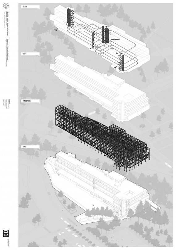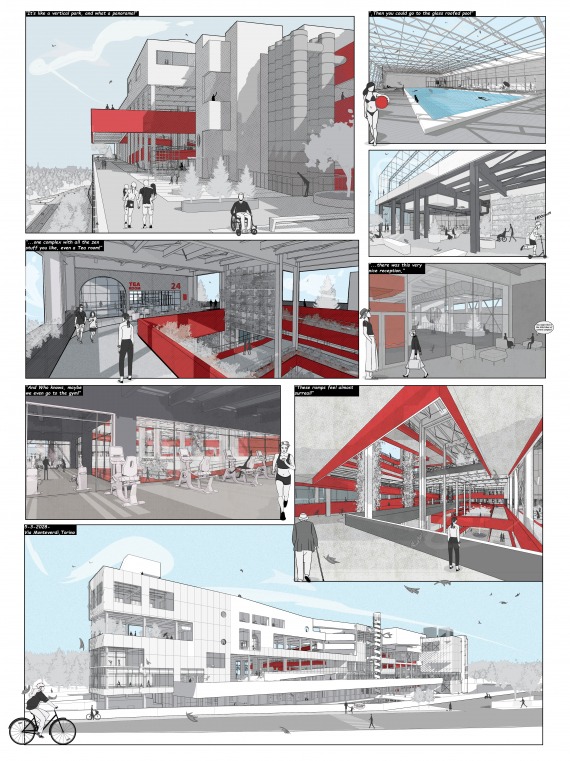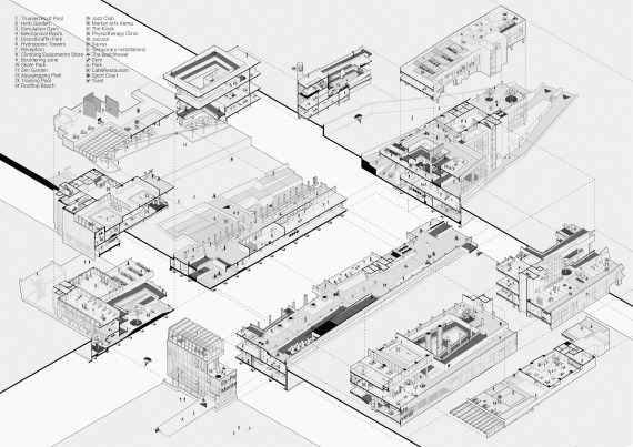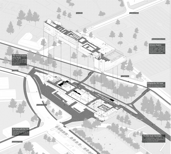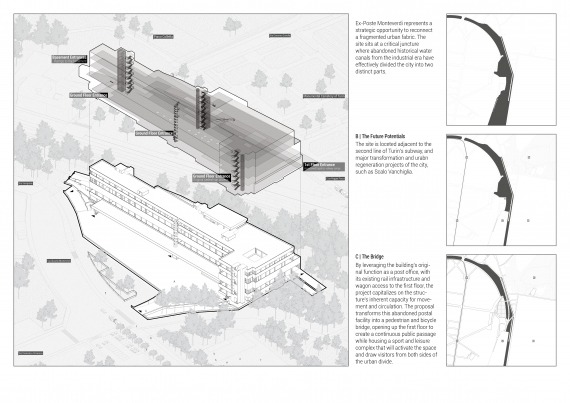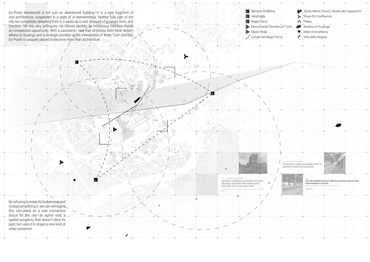 Abbiamo trovato Ex-Poste Monteverdi come un corpo mostruoso, spogliato e alla deriva nel mare urbano di Torino—non più architettura, ma neanche rovina. Relitto di un’infrastruttura perduta, il suo scheletro esposto ora dà forma a una trasformazione audace: parte ponte, parte strada, parte macchina civica. Non è restauro, è contraddizione. L’edificio resta in bilico, i suoi vuoti attivati con sport acquatici, arti marziali, terapia, caffè e spiagge sul tetto. Connette senza risolvere, abbracciando la frattura come strategia. Ex-Poste Monteverdi è un purgatorio vivente—architettura che rifiuta di appartenere, ma rivendica la propria essenzialità.